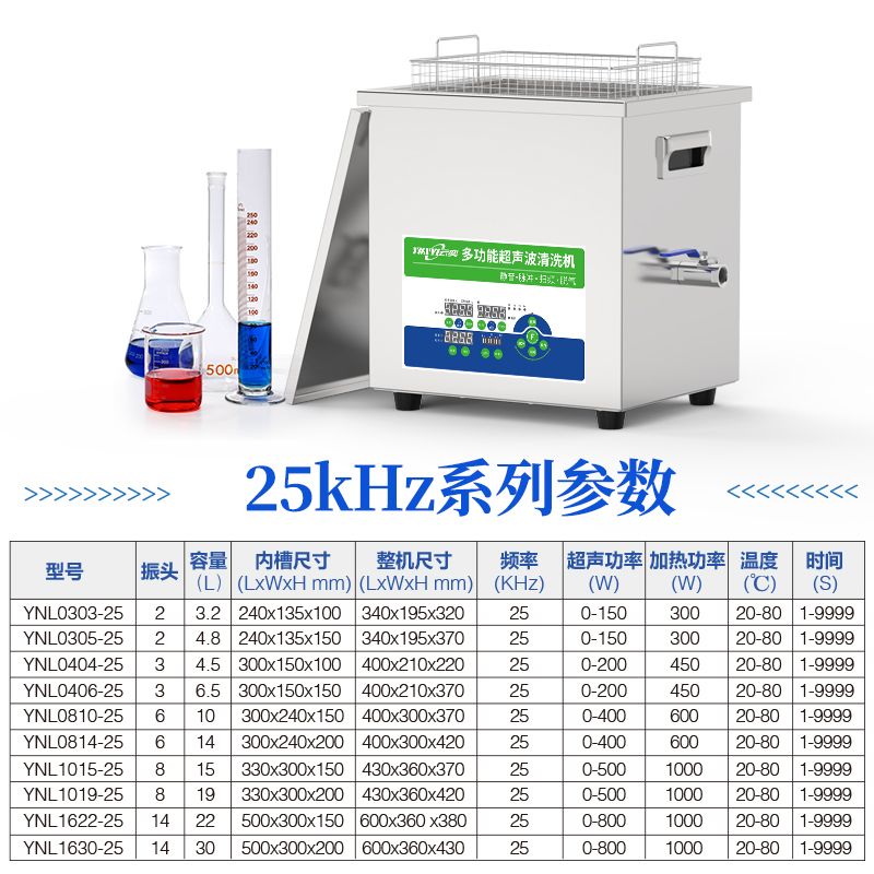 | | 超声频率:25 KHz | | 清洗温度:20-80 ℃ | | 时间控制范围:0-9999秒,支持常开 | |
