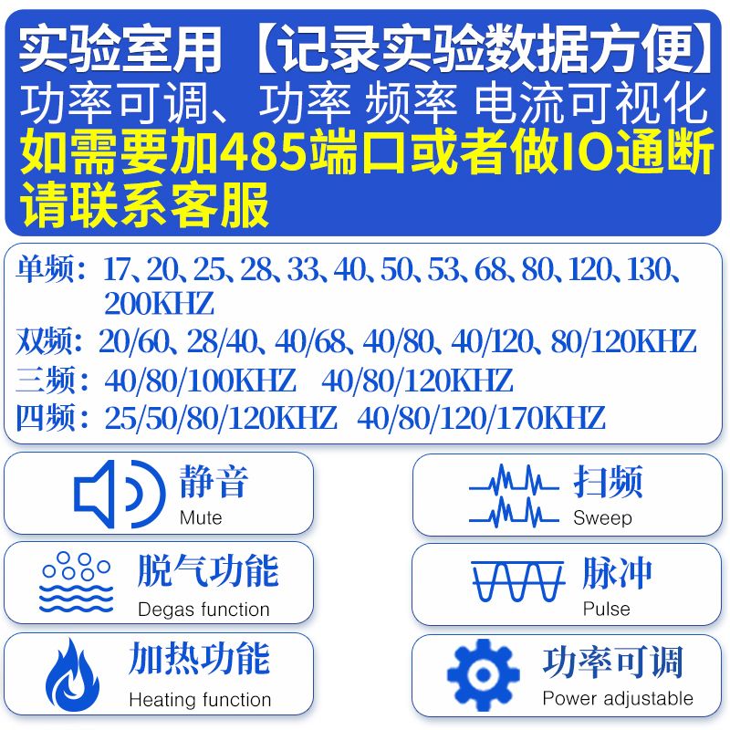 功能:静音、扫频、脉冲、脱气、加热、功率 频率 电流可视化、功率可调